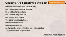 I remember thinking, <br />What is this feeling inside of me, <br />I talked it out <br />With a friend or two, <br />But what it was, <br />We had no clue. <br />I was quieter than usual, <br />Though not as bad as before <br />We wondered what it was, <br />That was hiding behind the door. <br />I didn't realize <br />It was because my friend needed me, <br />To help him take off his disguise. <br />God used me <br />like never before <br />And help like this <br />Had never before knocked at his door. <br />But what kind of friend could I call myself <br />If I left him in the dark, <br />Never told him how much I cared, <br />Only left a mark. <br />It was my pleasure to help him out <br />And I now realize what this was all about. <br />Because I had struggled with the same stuff, <br />Depression, hiding, locking myself away, <br />Doing anything I could, just to appear tough. <br />I knew these feelings, and what to do, <br />I knew how to help, <br />So what else could I do? <br />It wasn't all that easy <br />Probably easier said than done, <br />But we got through it <br />No more feeling dumb. <br />Sure, tears were shed, <br />But thats okay, <br />Thats part of the help. <br />Really, its okay. <br />Now things are better, <br />No more blood red. <br />No more disguises, <br />We can finally be ourselves. <br />We said our good byes, to this evil thing, <br />And now we no longer have to hide, <br />We are free <br />to just............be.<br /><br />beautiful imperfection<br /><br />http://www.poemhunter.com/poem/free-to-be-4/