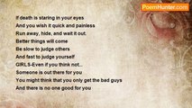 I am tainted <br />My skin <br />My breath <br />My soul <br />My heart <br /> <br />I am broken <br />My mind <br />My body <br />My life <br />My love <br /> <br />I lie here in pieces <br />Waiting to be cleaned <br />I blame myself <br />But he walked in the room <br /> <br />I cry silently <br />Huddling in a corner <br />His fist into the air <br />He left me there <br /> <br />I am tainted <br />I shall never be the same <br />I cannot gain what he has taken <br />I lie in pieces <br /> <br />I am broken <br />My body is crumbled <br />He was just angry <br />I don’t know what to do <br /> <br /> <br /> <br />To thoughs of you girls, boys, men, women that have been abused, raped, beaten, and brusied. I hope that in some way my poems could possibly help. Have faith and hope know that you are not alone.<br /><br />Scarred Unknown<br /><br />http://www.poemhunter.com/poem/bad-men/