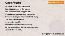 No people are uninteresting. <br />Their fate is like the chronicle of planets. <br /> <br />Nothing in them in not particular, <br />and planet is dissimilar from planet. <br /> <br />And if a man lived in obscurity <br />making his friends in that obscurity <br />obscurity is not uninteresting. <br /> <br />To each his world is private <br />and in that world one excellent minute. <br /> <br />And in that world one tragic minute <br />These are private. <br /> <br />In any man who dies there dies with him <br />his first snow and kiss and fight <br />it goes with him. <br /> <br />There are left books and bridges <br />and painted canvas and machinery <br />Whose fate is to survive. <br /> <br />But what has gone is also not nothing: <br />by the rule of the game something has gone. <br />Not people die but worlds die in them. <br /> <br />Whom we knew as faulty, the earth's creatures <br />Of whom, essentially, what did we know? <br /> <br />Brother of a brother? Friend of friends? <br />Lover of lover? <br /> <br />We who knew our fathers <br />in everything, in nothing. <br /> <br />They perish. They cannot be brought back. <br />The secret worlds are not regenerated. <br /> <br />And every time again and again <br />I make my lament against destruction.<br /><br />Yevgeny Yevtushenko<br /><br />http://www.poemhunter.com/poem/people-32/