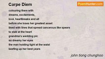 Ever so slowly the great wheel of life turns <br />Mother Earth smiles as we all scurry about <br />Searching for this and that <br />But what is it that we want…. <br /> <br />A bigger Teepee? <br />Or another concrete road <br />or maybe a larger TV <br /> <br />Some even refuse to keep score <br />While others long for what they had <br />Yet most keep thinking they want more<br /><br />John McCornack<br /><br />http://www.poemhunter.com/poem/carpe-diem-20/