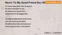 Devoted to love, <br />Ongoing efforts to share, <br />Caring for his family and to others. <br /> <br />Wearing his DOC gloves, <br />Infinite care, <br />Love to give and spare. <br />DOC WILDE, <br />Emperor heart, a Great Poet for us, here. <br /> <br />Beyond all <br /> <br />A great Human, <br />A friend, A giver <br />WILDE DOC…Doc Wilde <br />Blessed by God, <br />Blessed by Heart, <br />Thank you, I Thank YOU! <br />My friend, Doc.<br /><br />Florida Angel<br /><br />http://www.poemhunter.com/poem/doc-wilde-my-friend/