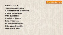 America, america, thou doth <br />Shine among human kind <br />Pulverised by all cultures, <br />With many wars behind, <br />Both good and bad, your people <br />Are kind understanding, <br />Except for the few misled <br />By the tounges of polticians <br />For their livelyhood and luxuries, <br />Your work, endurance for the world <br />So massive that none <br />Could match, but tried to be <br />Copied by many, and tried to be <br />Entered into the right and wrong <br />Ways to be spoken <br />As an American, melting into <br />Thy culture of prosperity <br />And tolernce made by <br />Sacrifices your fathers made. <br /> <br />Ravikiran Arakkal<br /><br />RAVIKIRAN ARAKKAL<br /><br />http://www.poemhunter.com/poem/america-thou-doth-shine/