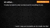 It hurts when i know you don't love me, <br />it just isn't fair, <br />it all makes no sense, <br />at's all too much pain and despair. <br /> <br />Whebn the pain is too much to bare, <br />i will just smile, <br />and i'll find that it will, <br />be alright in a while. <br /> <br />I may not at the moment think, <br />that theres any way i could recover, <br />but in the end i will, <br />begin to discover. <br /> <br />That life isn't just about love, <br />it's a whole world of pain, <br />and althoigh some may recover, <br />some still have a strain. <br /> <br />You were once the biggest thing, <br />and most important part, <br />of my once fun and, <br />love fulfilled heart. <br /> <br />but i guess things just change, <br />and feelings drift away, <br />like our once beautiful and true love, <br />that now has gone astray. <br /> <br />we couldn't keep the pasion, <br />or the once so great heat, <br />to the relationship that meant to much to me, <br />which once had all the beat. <br /> <br />I just want you to know, <br />that i love you very much still, <br />and you will always be a part of me, <br />even though it's the all time kill. <br /> <br />To admit i love you still, <br />when i know you don't even care, <br />all i can say to you now is that, <br />these feeling can never be repaired.....<br /><br />I wish i was as invisable as he made me feel<br /><br />http://www.poemhunter.com/poem/astray-love/