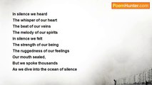 Through a settled spirit <br />A wandering mind, <br />And calm of my conscious <br />Inside my head I heard silence <br />Saying, <br />“From the beginning of time, till eternity <br />The sun never says ‘you owe me’ <br />For giving life and its warmth <br />Through its light to planet earth” <br /> <br />Silence spoke, <br />“Never expect from others to get <br />For into pain dreams will melt <br />Your inner light will turn to darkness <br />To shine as it ceases <br />When there is no one something to give <br />Even a smile… <br />So learn to be like the sun” <br /> <br />Silence spoke <br />Through its unspoken words <br />That sprung from the depth of my conscious <br />As I contemplate in the abyss of silence <br />This great saying- <br />“Even after all these years the sun never said to the earth you owe me” <br />Never expect.<br /><br />Fasika Ayalew<br /><br />http://www.poemhunter.com/poem/silence-spoke/
