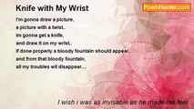 as i clutch my cure, <br />i tightly lock the door, <br />and my smile reappears, <br />as my blood hits the floor... <br /> <br />Thanks dad! !<br /><br />I wish i was as invisable as he made me feel<br /><br />http://www.poemhunter.com/poem/my-cure-a-knife/