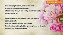 Their eyes that were once soft blue pools of love, <br />Esteem and trust <br />Could land softly and float freely above; <br />Now they’re <br />Grey sharp rocks of flint, hoping to slice; <br />probing for weakness and fear, <br />Come closer people please draw near; <br />I need you to come near and whisper in thy ear; <br />Loving butterfly don’t fear to tread and land; <br />And drink nector from their soft hands; <br />Her tongues that spoke only <br />Gentleness along the shores, <br />now is a raging turrents, cutting the banks <br />of every harbor, <br />Her presence left you feeling stable and anew; <br />Now feed nothing but the growing flood of despair; <br />Once a playful dance, now steps to crush, <br />Their pink heart now gray with dust.<br /><br />Kimberly Woodward<br /><br />http://www.poemhunter.com/poem/stealing-beauty/