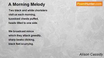 a tiny fire-tail finch <br />ducks and weaves <br />furtively <br />amongst the grevilleas. <br /> <br />a flash of red <br />a whir of wings <br />a cheerful chirp. <br /> <br />a huge cockatoo <br />lands on the power-line, <br />peers down at me <br />and slowly raises his magnificent crest. <br /> <br />a flash of yellow <br />a white tailored suit <br />a blood-curdling screech! <br /> <br />an old Rhode Island red <br />scratches dustily, <br />feathered bum drooping, <br />eyelids wrinkled. <br /> <br />a flash of childhood <br />a warm brown egg <br />a comfortable clucking.<br /><br />Alison Cassidy<br /><br />http://www.poemhunter.com/poem/morning-has-broken-2/