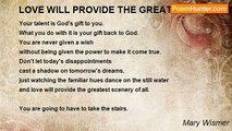 'Cross mountain & valley, desert & shore <br />Eternal will echo your thunderous roar <br />Far deep & mighty though you may be <br />Beauty of this world in unity <br />Mightier still will be my quill <br />When pages & years together we fill <br /> <br />A fountain is wasted. <br />A well of water in a country dry. <br />and anything that's honest and good, an eye <br />that makes the whole world bright. <br />My heart will be your shelter, <br />and my arms will be your home'.<br /><br />Mary Wismer<br /><br />http://www.poemhunter.com/poem/my-heart-will-be-your-shelter/