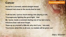 I often wonder will I be one of the lucky ones <br />To be given a new reprieve on life... <br />Given a second chance to appreciate <br />All the things in life I have taken for granted. <br />Suicidal thoughts and attempts thru out the years <br /> <br />When I should have held fast to all that is dear to me <br />The beauty that I was too selfish to acknowledge... <br />I want to live life to its fullest, watch my kids grow <br />Walk in the rain, play in the sun... <br />I know we all must go sometime but please, please <br />Not this soon... not with cancer <br /> <br />The suffering of endings and new beginnings. <br />I weep, but not in horrible pain, not in the pain and fear of <br />Being abandoned, left alone, sweltering in my own mind’s rhetoric. <br />My tears now are of life and lives lived and unlived. <br />Songs that have not yet been sung, I weep in joy, <br />I dance among the stars, I long for the beauty of the <br />waves of the ocean to return to me. <br />Pulsing over and over me in ecstatic abandon. <br />My blood remembering the feel of life; <br />the Heavens exploding above my Head. <br />The stars shooting, falling for Just us. <br /> <br /> <br />31.December 2007<br /><br />Mary Wismer<br /><br />http://www.poemhunter.com/poem/cancer-ii/