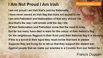 Oh Ireland Mother Ireland brave men for you have been shot <br />But are you worth one cup of human blood you most certainly are not <br />Your noble sons who fought for you by British guns were slain <br />But what value to a dead hero is worthless immortal name. <br /> <br />If those noble men who died for you could have looked into future day <br />I am sure that they would have ended life in a much more natural way <br />Our politicians have betrayed them and their deaths have been in vain <br />As we are in the Common Market now and our sovereign rights sold down the drain. <br /> <br />In Ireland today the rich get richer and the poor getting more poor <br />As they struggle for survival like rats in an enclosed sewer <br />What with work a getting scarcer and the cost of living high <br />For the working class of Ireland I can see no future joy. <br /> <br />Oh Ireland Mother Ireland your fields are evergreen <br />You are the greenest Land on all God's Earth, the World beauty queen <br />Ah but Ireland would I die for you I most certainly would not <br />I would rather die the natural way and be buried and forgot.<br /><br />Francis Duggan<br /><br />http://www.poemhunter.com/poem/oh-ireland-mother-ireland/