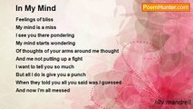The mind of a poet. <br />Its not neat, clean, or tidy. <br />Nothings in order, <br />A paper hear a paper there. <br />Words scattered though out our minds. <br /> <br />Eccentric? <br />Maybe… <br />Crazy? <br />Only sometimes. <br />But the only thing that describes it all is <br />The Mind Of A Poet. <br /> <br />Always changing, <br />Confusing odd and a little strange <br />It’s a mind of a poet. <br />Also known as: Me.<br /><br />lilly mandrell<br /><br />http://www.poemhunter.com/poem/in-the-mind-of-a-poet/