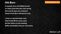 When I travel ‘cross the country <br />And I want to get a ‘country’ flavor <br />I try to get off the beaten path <br />That way I do myself a favor <br /> <br />For that is where we see the way <br />Folks really and truly live <br />Life slows down and glides along <br />Yes, country has so much to give <br /> <br />This is where we see, my friend <br />Wonderful old-fashioned farms <br />And in the midst of the landscape <br />Are the charming country barns <br /> <br />At the same time we see animals <br />That we love so very much <br />The cows, horses and chickens <br />That add to that country touch <br /> <br />The barns can be so different too <br />Many styles and sizes as well <br />It depends on what the farmer needs <br />And with the barn you can tell <br /> <br />So next time you do some traveling <br />Get off the Interstate to see farms <br />For that is when you can observe <br />Those wonderful back-road barns!<br /><br />Marilyn Lott<br /><br />http://www.poemhunter.com/poem/back-road-barns/