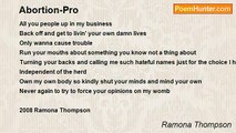 Say what you want <br />Do what you want <br />Call it whatever the hell you want <br />In the end <br />It's all the same <br />Bleeding <br />Crying on the floor <br />There will be the responsibility you did't want <br />The child you were too damn selfish to love <br /> <br />No time <br />No room in your oh so self absorbed life <br />Not for anything or anyone but you <br />Your needs <br />Your desires <br />That's all that really matters <br />Just can't risk that career or that life in the fast lane <br />Just can't miss out on another night of partying and gettin' high <br />Gettin' high and gettin' laid by another nameless, faceless stranger at the local club <br /> <br />Ms. High and Mighty <br />Ms. Too Good To Ever Be <br />Just another in a long line of working mothers <br />Breaking their backs <br />Day in and day out <br />While all you do is sit there all day on your fat a.... <br />Moaning and groaning about poor little you <br />Knocked up again with a choice you pretend you really don't wanna make <br />When we all know that you really love being the center of this much attention <br /> <br />Went too far <br />Got pregnant just to be in the spotlight <br />The spotlight of the world's attention <br />Asking <br />Will you or won't you? <br />Your body <br />But hell no, it should't be your choice <br />When you're no God <br />You're only human <br />Only flesh, blood and bone <br /> <br />Flesh, blood and bone that I pray remembers <br />Next time <br />Before it's too late and you can't go back from the choices that you make <br />These 4 simple little words..... <br /> <br />ABORTIONS KILL BABIES DEAD! <br /> <br />2008 Ramona Thompson<br /><br />Ramona Thompson<br /><br />http://www.poemhunter.com/poem/abortions-kill-babies-dead/