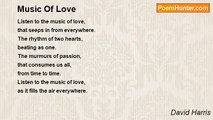Sitting in a rocking chair <br />on a porch in a summer eve. <br />A warm breeze drives <br />the garden fragrances through the air. <br />You close your eyes and relax <br />and listen to the music of the night, <br />to the creatures of the night time <br />calling through the stillness to be found. <br />The leaves rustling <br />pushed by the warming breeze, <br />the lonely hoot of a wise old owl <br />perched high somewhere, <br />the chirping of the crickets <br />in their mating call <br />and the almost silence <br />of a bat’s flapping wing. <br />Those are just a few of the sounds <br />you’ll hear as you relax back <br />and listen to the music of the night. <br /> <br />27 March 2008<br /><br />David Harris<br /><br />http://www.poemhunter.com/poem/music-of-the-night-3/