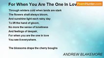 When blossom drapes the orchard boughs <br />Like freshly fallen snow, <br />When sleeping lands begin to rouse <br />And slowly start to grow, <br />When daffodils do grace the way <br />And shine like burning gold, <br />It is indeed a fine display <br />When springtime does unfold. <br /> <br />When bluebells light the woodland floor <br />No better place to be, <br />Than when that ocean sweeps before <br />In all its majesty, <br />And when the hawthorn's dressed in white <br />And borders every field, <br />It fills my heart with such delight <br />To see it thus revealed. <br /> <br />When daisies in the meadow rise <br />And open in the sun, <br />And swallows swarm the April skies <br />I know that spring's begun, <br />And when the birds shall sweetly sing <br />From every branch and tree, <br />Each joyful note that they will bring <br />Shall mean so much to me. <br /> <br />When blossom drapes the orchard boughs <br />Like freshly fallen snow, <br />When sleeping lands begin to rouse <br />And slowly start to grow, <br />When winter's cold is at an end <br />And browns then turn to green, <br />Those precious gifts the spring shall send <br />The greatest ever seen.<br /><br />ANDREW BLAKEMORE<br /><br />http://www.poemhunter.com/poem/when-blossom-drapes-the-orchard-boughs/
