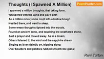 Thoughts like ribbons strewn on the ground <br />Trailing like wraiths but leaving no sound <br />If thoughts are things then they should not <br />Then they should not disappear <br />Walk away, in silence just like that; <br />Then they, like rainbows cannot be caught <br />Then they, like birds can scatter into flight <br />Then they, like hope can be sought <br />Or then they can <br />Like shimmering grains of sand <br />Take movement and form but out of sight <br />Thoughts like dreams can fly away <br />Far, far into the starry night. <br />Far across a green meadow <br />Without even leaving the faintest shadow <br />Blend into clouds, trees, fields and earth <br />But that is also sometimes the way thoughts take birth.<br /><br />Rani Turton<br /><br />http://www.poemhunter.com/poem/thoughts-like-ribbons-strewn-on-the-ground/