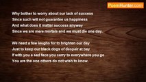 Your best is not good enough but that is okay <br />There's always one better it does seem that way <br />The best does not remain best for a long period of time <br />We slowly slip backwards from the peak of our prime. <br /> <br />At least in your efforts you can take some pride <br />And you can feel happy that at least you've tried <br />The name of the winner most people recall <br />But you can feel happy that you gave it your all. <br /> <br />There are winners in business and winners in sport <br />On the stock market and football and on the tennis court <br />But for every winner who makes headline news <br />So many it does seem are destined to lose. <br /> <br />And though this time you did not win the next time maybe <br />You will be the one to enjoy victory <br />You did try your best and though you did not succeed <br />In your philosophical nature by example you lead.<br /><br />Francis Duggan<br /><br />http://www.poemhunter.com/poem/you-did-try-your-best/