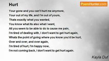 I will never be with you <br />I always need something new <br />Don't you get I'm over it <br />You make me want to spit <br />Go ahead and take a hit <br />And throw me against your wall <br />Even if it makes me fall <br />Be yourself around everyone else <br />Then they will see how you treat me<br /><br />Kayla Degraw<br /><br />http://www.poemhunter.com/poem/hurt-me-4/