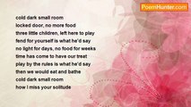 I promised you I'd always be there <br />When you needed me most, you were all alone <br />How do I learn to live with the fact <br />I broke a promise I can't take back <br />Alone were you, in the cool morning air <br />Alone by yourself, through that aweful nightmare <br />Alone by yourself when you got taken from me <br />No one to hold your broken bones <br />No one to help you; you were alone, alone <br />With a mothers love I should have been there <br />To hold you through that aweful nightmare <br />Now that you're gone, I hate myself <br />I left you alone, to die by yourself<br /><br />jeannie schmidt<br /><br />http://www.poemhunter.com/poem/alone-to-die-by-yourself/