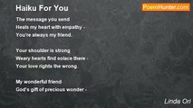 A human blossom <br />Blooming with the breath of life - <br />Totally awesome <br /> <br />Mother sleeps in peace <br />Weary from the long ordeal - <br />All her worries cease <br /> <br />Father holds his son <br />Tears of pride now overflow - <br />All his fears undone <br /> <br />Life begins anew <br />Things will never be the same - <br />No more sleep for you! <br /> <br /> <br />7/18/2008<br /><br />Linda Ori<br /><br />http://www.poemhunter.com/poem/baby-haiku/