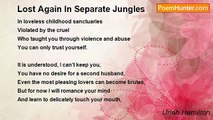 Desire never ceases <br />Because she’s gone, <br />Memory returns her <br />Tightly into my embrace. <br /> <br />Summer dresses <br />And lovely jaunts <br />On flowery streets, <br />Sunlight laughter <br />Fills the park. <br /> <br />Forever I’ll recall <br />Her brown hair <br />On cloud-white shoulders <br />And whispering her name <br />At an Indian restaurant. <br /> <br />It’s hard to live <br />In a world of unforgiving clocks <br />Where every passage of time <br />Takes you further away <br />From ever being in love again.<br /><br />Uriah Hamilton<br /><br />http://www.poemhunter.com/poem/ever-being-in-love-again/