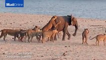 Elephant defends itself against attack from pride of lions