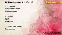 1. I’m still <br /> Shadow walks <br /> West-east highway. <br /> <br />2. Insect on the <br /> Yellow pumpkin flower <br /> New life. <br /> <br />3. In the fern forest <br /> Mongooses make love <br /> Beckoning teenage.<br /><br />Ashraful Musaddeq<br /><br />http://www.poemhunter.com/poem/haiku-nature-life-17/