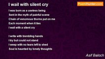 There are humans but no humanity left inside <br />They hurt their loved one’s with the dagger of lies <br />A silent tear dropped inside <br /> <br />An old man sitting by the road side <br />Dry tears of sadness in his lonely eyes <br />Left by his children to beg and die <br />A silent tear dropped inside <br /> <br />They tolerate loneliness with a smile <br />Caged like animals and no one hear there cries <br />Worn out cloths and tears of innocence in there eyes <br />Hurt by there love one’s and kept away in disguise <br />A silent tear dropped inside <br /> <br />They search for heaven in mosque, temple or in the skies <br />They forgot that they were in the belly of heaven for nine lives <br />They were loved, cherished and taught how to fly in the skies <br />Just for there self pleasure and happiness they put there <br />heaven to weep and cry <br />A silent tear dropped inside <br /> <br />There’s so much pain in the world outside <br />I want to help them but my hands are tied <br />As I watch them through my painful eyes <br />A silent tear dropped inside <br /> <br />- <br />This poem is dedicated to those womens who are in the prisons for life without even proven guilty...and those parents who are forgotten and forbidden by there children....even though I think this poem is incomplete<br /><br />Asif Baloch<br /><br />http://www.poemhunter.com/poem/a-silent-tear-sample/