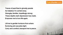 Lying in stillness, and listening, I try <br />Catching the dewdrops song to the morning. <br />Soundless warmth falls from a brightening sky <br />Aglow with ethereal delight of the dawning. <br />Purring leaves sigh as a breeze rustles air. <br />Floating gossamer downwards, it catches <br />Shivering grasses, which mutely declare <br />Their delight as each resonance passes. <br />Rocks inaudibly stir, subtlely moving <br />To harpstrings of silence heralding day. <br />Motionless life welcomes refrains, approving <br />The message that, soundless, melodies play. <br />An earthwide Concerto of Love, unheard. <br />This music of silence needs not a word.<br /><br />Fay Slimm<br /><br />http://www.poemhunter.com/poem/music-of-silence/