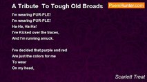 Honey girl, be as free as you can be! <br />I mean, go ahead, paint your toenails <br />Flaming Scarlet, or Honey Pink ~ ~ ~ <br />That is, if you so prefer ~ ~ ~ <br /> <br />For it is surely as true for me <br />As it seems to be for you, <br />That we fought for the right, <br />Burned our bras and everything ~ ~ ~ <br />Even gave up a girdle or two ~ ~ ~ <br /> <br />Just so we could wear flip-flop shoes, <br />And do a Jimmy Buffett song or two <br />As we danced on the beaches of our lives! <br /> <br />And Straight UP, Girlfriend, <br />Life does go on with its pleasures, <br />Even when we are alone, by choice... <br />We still have the voice, <br />Don't WE? ? , to say... <br />Well, whatever we want to say, <br />And DO whatever we want to do... <br />Thank you, I mean to say, <br />For burning the piano that WAY! ! <br /> <br />Scarlett Treat <br />October 15,2008<br /><br />Scarlett Treat<br /><br />http://www.poemhunter.com/poem/song-for-the-old-hippie-gal/