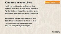 Love & kindness have a way <br />of brightening up the darkest day <br />And when your soft words I hear <br />you chase away my inner fear <br /> <br />When you whisper my name <br />I can feel you hold me tight <br />And when I have a bad day <br />you still do make it right<br /><br />Tia Maria<br /><br />http://www.poemhunter.com/poem/love-kindness/