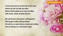 Come on down the road a piece <br />just come and pull on in the drive! <br />If you don't see me out in the yard <br />then I might be just inside! <br /> <br />Come on in and set a spell <br />kick back and let's just talk a bit! <br />Now pour yourself a cup of coffee dear <br />and let's both, chat and sip! <br /> <br />Come on down the road anytime! <br />I'm always ready, to have a friendly, neighbor talk! <br />I'm not ever that far away, you know? <br />where you couldn't, just walk a bit! <br /> <br />- By Linda Winchell <br /> Published 2008/04/11<br /><br />Linda Winchell<br /><br />http://www.poemhunter.com/poem/come-on-down-the-road/