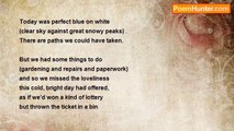 Each day's a diamond <br />when you lose someone you love. <br /> <br />You realize just how near death is. <br /> <br />We walk along a narrow ridge, <br />steep cliffs on either side. <br /> <br />And as we go, <br />our relatives and friends may fall, <br />forced off by accidents or illness, <br />as we ourselves may be, at any time. <br /> <br />So I repeat <br />each day's a gem: I'm learning to appreciate <br />its colour, light and shape.<br /><br />Robert Melliard<br /><br />http://www.poemhunter.com/poem/each-day-s-a-diamond/