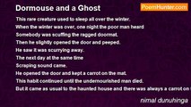She embraced me in the pitch darkness <br />And her rigourous kiss was very painful <br />As her wisdom tooth pierced my pale lips. <br />And she raped me. <br />I realized her sarcastic smile <br />Looking at my prostration. <br />I feel the yield sorrowful death while alive <br />And she fades away.<br /><br />nimal dunuhinga<br /><br />http://www.poemhunter.com/poem/the-ghost-s-nymphomaniac-wife/
