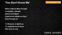 Arayette sat <br />on the driftwood <br />her feet hanging limply <br />as the water eased <br />quietly toward shore <br />kissing her ankles <br />before rejoining <br />the restless ocean <br /> <br />The night was still <br />pulsating with the energy <br />left behind by the crowd of <br />surfers who had wandered <br />away an hour before <br /> <br />Every now and then <br />a soft breeze lifted <br />a wisp of Arayette's hair <br />and played it across <br />her moist lips <br />causing her mouth <br />to unknowingly smile <br /> <br />She automatically <br />raised her hand and <br />removed the mischievous <br />threads of hair <br />letting her mouth <br />return to its <br />original look of <br />hopelessness <br /> <br />Her shoulders bare <br />but for the thin straps <br />of the hot pink bikini <br />suddenly sagged and <br />if not for a slight <br />movement whenever she <br />remembered to breathe <br />life amidst the beauty <br />was not hers to claim<br /><br />CAROL HUGHES<br /><br />http://www.poemhunter.com/poem/unfeeling-amidst-beauty/