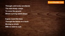 The mist moved across the field <br />swallowing up everything in its path. <br />A white blanket that hovered <br />inches above the ground. <br />It came in the cool of dawn <br />and vanished like a ghost <br />near the beginning of the day. <br />While it stayed, you could not see <br />anything within a foot of thee. <br />The mist that came like a sleeking ghost <br />was now gone after being hit <br />by the rays of the morning sun. <br /> <br />27 September 2008<br /><br />David Harris<br /><br />http://www.poemhunter.com/poem/mist-11/