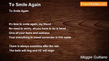 Go For That Smile <br /> <br /> <br />They say, smile though your heart is aching <br />I say, i go for someone who will make me smile <br />And make my dark day bright and sunny <br />So go and find the one that will make your heart smile. <br /> <br />Smile smile smile..God bless you<br /><br />Meggie Gultiano<br /><br />http://www.poemhunter.com/poem/go-for-that-smile/