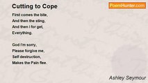 The Stress overwhelms me, <br />I can’t take no more, <br />So I put on my shoes, <br />And head to the store. <br /> <br />I thought I was strong enough, <br />I thought I could cope, <br />But the need overtakes me, <br />And now there’s no hope. <br /> <br />Straight for the razors, <br />At Right Aid I head, <br />And then to the band aids, <br />To soak up the red. <br /> <br />When I get home, <br />To the bathtub I go, <br />So the blood can flow freely, <br />And no one will know. <br />How week I am, <br />To live this way, <br />Slicing my skin, <br />To get through the day. <br /> <br />The blade to my leg, <br />I move it forward and back, <br />Until my feelings are numb, <br />And the screen fades to black. <br /> <br />Ask me what’s wrong, <br />No words you will hear, <br />But the gash on my ankle, <br />Makes it perfectly clear. <br /> <br />Anxiety hits, <br />On other days too, <br />In side I feel sick, <br />Like I have the flu. <br /> <br />The nausea, <br />It has no end, <br />On the bathroom floor, <br />Much time I do spend. <br /> <br />My head in the toilet, <br />I can’t hold it in, <br />I vomit my brains out, <br />I know it’s a sin. <br /> <br />On still other days, <br />No food I can eat, <br />Held fast by emotions, <br />And goals I can’t meat. <br /> <br />Punishment, <br />At least for me, <br />Is necessary, <br />The way it must be. <br /> <br />Pain is beautiful, <br />I tell you it’s true, <br />If I didn't have it, <br />No day I'd get through.<br /><br />Ashley Seymour<br /><br />http://www.poemhunter.com/poem/pain-is-beautiful/