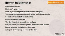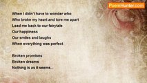 These tears tell a story of mine <br />With my so called little miss sunshine <br />Your tearing me up deep inside <br />And the pain inside me I can’t hide <br />I can’t hold back the tears <br />After witnessing my fears <br />Then you and him shot me down <br />And scattered my wings all around <br />These wounds of mine won’t heal <br />Leaving me unable to love or feel <br />You’ve drained the love out of me <br />At the cost of me being free <br />At least you’re not in sight <br />As I walk into the cold night <br />First you left me dying <br />And now you come back crying <br />You bit me like a venomous snake <br />Leaving me to cry out a lake <br />The venoms mixed with my vein <br />Leaving me broken and insane <br />Its too little too late I have gone <br />After realising you’re not the one <br />I don’t care what you say <br />Please just go away <br />No need telling me you can change <br />I have left now and am out of your range <br />Your not the one and never were <br />Don’t try blaming him or her <br />You haven’t got no one to blame <br />You brought me sorrow and shame <br />Cant you see the anger in my eyes <br />After listening to all your stupid lies <br />Why do you keep denying it <br />After cutting me up bit by bit <br />You have cut me up with a knife <br />Now just stay out of my life <br />You tell me that you need me <br />Yet your with him when I can’t see <br />Never will I be able to fly again <br />Its too much trouble and strain <br />You’ve somehow broken my wings <br />Now I can’t focus on other things<br /><br />Yassar Ali<br /><br />http://www.poemhunter.com/poem/broken-dreams-24/