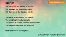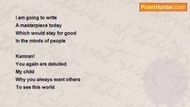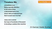 Smokes all around my eyes <br />Pink, blue, violet and grey <br />All colors; hundreds of shades <br />I couldn’t see anything <br />But could feel <br />The sharp contours of silky skins <br />Te burning touch of tender hands <br />The quenching ambiance of sizzling lips <br />The dying distance of shrinking bodies <br />The throbbing music of vanquished hearts <br />And the proliferating euphoria of paralyzed minds <br /> <br />Then the moment <br />I was so overwhelmed <br />By the love so divine <br />I burned all the boats <br />As my soul found a new body <br />Ah’ <br />I heard her voice <br />She spoke to me <br />As it was for the last time <br />She said it all in a dying whisper <br />Kamran! <br />Never forget <br />What you told me once <br />“Love has to be eternal” <br /> <br /> <br />Feb 25,2009<br /><br />Dr Kamran Haider Bukhari<br /><br />http://www.poemhunter.com/poem/love-has-to-be-eternal/