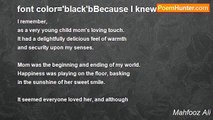 I sit alone. <br />Wondering what went wrong. <br />I was talking about my plans for the future. <br />I could not understand. <br />So cold were his face and hands. <br />I ask my God why? <br />Silence was his reply. <br />Another loss, I have gained. <br />I held my chest to stop the pain. <br />My God! Now, my Father? <br />So, innocent and young. <br />I held his hand close to my heart, <br />this was how my mourning started. <br />I love you mom and dad, you are in good hands. <br />No more harm or pain from me. <br /> <br /> <br /> <br />(This poem is about what I felt when my father died, and I was beside the deathbed holding his hand)<br /><br />Mahfooz Ali<br /><br />http://www.poemhunter.com/poem/font-color-purple-b-you-are-in-good-hands-a-grieving/