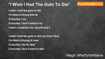 I just feel so down <br />I only frown <br />I have no smile left <br />Depression is a theft <br />I hate that I feel this way <br />I wish my feelings will go away <br />But I guess they're here to stay <br />I feel like I don't care <br />But I swear <br />That I can't bare <br />To be without feelings <br />And my heart isn't healing <br />Like it should <br />But I would <br />Do anything to take the pain away <br />I'd do it today <br />I wish I could talk about it <br />But my parent's would throw a fit <br />If they found out my reasons <br />It's just not the right season <br />To tell them how I feel <br />But I'll make you a deal <br />I'll tell you <br />If you believe it's true <br />Do you? <br />Good because you should <br />Now I could <br />Tell you all about it <br />But please don't throw a fit <br />It's because of my dad <br />He makes me so sad <br />And then he gets mad <br />At me for nothing <br />And I'd do anything <br />To make him proud of me <br />But he can't see <br />That I try too hard <br />I play the wrong card <br />Because he has no clue <br />That I'm sick with the depression flu <br />And my mom <br />Tries to play dumb <br />She says she'll love me no matter what <br />But she still treats me like a mut <br />I still have feelings <br />Even if my heart isn't healing <br />I can still feel the pain <br />That they're making me gain <br />I want you to accept me <br />But you can't see <br />That I am what I am <br />And you side with them <br />And you don't accept me <br />I just want to be me <br />And I want them to love me <br />I wanna make them proud of me! <br /> <br />*(A poem that tells so many secrets of mine, A poem where my parents wished they weren't mine, A poem that proves I'm not fine.) *<br /><br />Magic What'sHerName<br /><br />http://www.poemhunter.com/poem/depression-x/