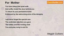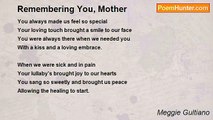 A Mother's Love <br /> <br />Nowhere will i find a love like a mother's love <br />Who did her best, to look her best <br />Whose love abounds, unconditional, endless <br />Outshines her beauty, because she is full of bounty <br />To the greatest joy of her life..her children <br /> <br />She would not trade for anything, for any treasure <br />They are the best things that ever happened to her <br />If only she could give all her life <br />Be born again and again <br />She will choose to be a mother <br />To the children she loves and adores. <br /> <br />The palm of her hands <br />Brings a touching offering of a smile <br />Making her children feel special <br />And being there when they need her <br /> <br />In sickness and in pain, <br />in the midst of the storm <br />She creates a song <br />That echoes sweetly of peace and joy in their hearts <br />bringing a lullaby <br />rocking them into a deep slumber <br /> <br />How sweet it is to have a mother <br />Who paints a meaning and a goal in our lives <br />The sunshine is even more bright <br />With her by our side..what can we ask for more<br /><br />Meggie Gultiano<br /><br />http://www.poemhunter.com/poem/a-mother-s-love-42/