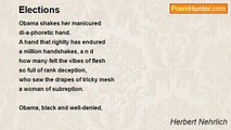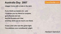 With a sneer and a grin <br />and a fistful of dough <br />they emerge from the bin <br />brown of toe, brown of toe. <br /> <br />There is bent-ear Costello, <br />also pitiful John. <br />Both would fit a bordello <br />though they can't get it on. <br /> <br />With their snouts full of loot <br />and their knickers in knots, <br />a big horn that goes toot <br />in the big parking lots, <br /> <br />they are once again chanting <br />how they'll govern the land, <br />though their raving and ranting <br />like a soup all too bland. <br /> <br />Folks are dumb to their nipples <br />cannot tell what's at stake. <br />Cannot see those small ripples <br />as it moves, the old snake. <br /> <br />As he rests there, he's losing <br />worn-out skin, every flake <br />I can't find it amusing <br />that he's simply a snake. <br /> <br />Nothing WILL change a coward <br />nor a crook or a thief, <br />let us throw out John Howard <br />as commander in chief. <br /> <br />If we keep re-electing <br />those old limp dicks who screw <br />folks, while slyly dissecting <br />our family ewe, <br /> <br />we shall soon find that living <br />as we thought it would be <br />turns perpetual giving, <br />while we're down on one knee. <br /> <br />So, I wish you dumb wankers <br />who were born with short pins, <br />a huge glut of new bankers <br />and a nuclear rinse.<br /><br />Herbert Nehrlich<br /><br />http://www.poemhunter.com/poem/election-2007-australia/