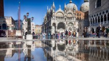 Tourists wearing plastic boots walk on ramps in a flooded St. Mark's Square in Venice, as the "Acqua Alta" (High Water) hit the coastal Italian city. The high water is a combination of high tides and a strong Scirocco wind. Duration: 00:42