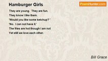 The hamburger girl smiles nicely at my gray hairs <br />I look forward to placing my order with her <br />The manager can not tolerate the chaos of success <br />Sweeps in and takes my order <br />Delivers the product and is done <br />NEXT! <br />More was acquired than an ice cream cone. <br />Somehow, something precious and unspoken was lost.<br /><br />Bill Grace<br /><br />http://www.poemhunter.com/poem/hamburger-girl-ii/