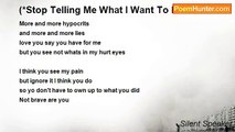I talk for no noise <br />I scream for silence <br />I cry for no tears <br />I fight to make an alliance <br /> <br />I move for stillness <br />I breath to know I'm dead <br />I yell for quiet <br />I wake up to go bed <br /> <br />I look to see darkness <br />I run to stay in one place <br />I smell to exhale you out <br />I close my eyes to see your face <br /> <br />I care to show hate <br />I work hard to slack <br />I look at my past to see my future fate <br />I say 'I love you' to hear it back<br /><br />Silent Speaker<br /><br />http://www.poemhunter.com/poem/what-i-do-8/