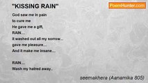 When it rains, I go out <br /> Standing there <br />Letting it hit me, <br />I don’t mind getting wet. <br /> <br />Let me feel the rain….. <br />That gently touches my soul, <br />And takes away my pain..! <br /> <br />Let me feel on my face.. <br />So that no one can see me crying… <br /> <br />Let the rain kiss me <br />Let the dropp hug me, <br />As it slowly soaks, <br />Through my hair and clothes, <br />Gently caressing the heart <br />And every heart beat <br />Embraces each dropp of love! <br /> <br />Let me fall in love. <br />I have a smile on my face <br />And I am ready for love <br />Oh! Where do you come from <br />You little dropp of rain…….! !<br /><br />seemakhera (Aanamika 805)<br /><br />http://www.poemhunter.com/poem/let-me-feel-the-rain/