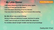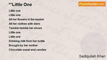 With prayers of innocence the sweet little girl <br />The smile in her eyes was as if an angel <br />Her round face with beaming radiance <br />Her hairs so done the way that’s casual <br /> <br />For me I know the day when it ends <br />I shall see her no sadder than that <br />In her gloom was the quest of the years <br />Will she see the beloved again in dreams <br /> <br />What is written on the flower lips naïve <br />I cannot leave her in the custody of nature <br />Universal soul might not be that tender <br />I would not have asked eternity for longevity <br /> <br />In growing emotion she saw herself <br />Flying into the clouds up to the skies <br />For some colors than were on the rainbow <br />May I ask her to hold my finger on the walk <br /> <br />We shall catch some butterflies this spring <br />We shall eat black berries in the summer afternoons <br />We shall then sit near the little spring under the tree <br />We shall then gaze into the setting sun for its hues <br />21/7/2009<br /><br />Sadiqullah Khan<br /><br />http://www.poemhunter.com/poem/the-sweet-little-girl/