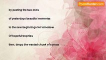 </>The little girl sat under the mango tree <br />Swinging her feet up and down on the swing <br />Staring into space <br />Oblivious to the surroundings <br />A little butterfly flew past her <br />Grazing her ears as it flew <br />Dark raven hair framed her tiny face <br />Long dark lashes cascaded hazel eyes <br />A teardropp escaping her eyelid <br />Gently fell on her cheek <br />Inside the wooden hut <br />The woman stumbled once <br />Her nose bled <br />Her feet numb <br />Her lips blue <br />She held the suitcase tight <br />The door closed forever <br />She walked slowly towards the girl <br />A dark shadow towered over her <br />Obscuring her from her own flesh and blood <br />Such a sacrifice <br />For her freedom <br />From the gallows <br />A second of hesitation <br />They looked at each other <br />Child and adult <br />Oh how she longed to hug the tiny creature <br />The fruit of her womb <br />Reassurance? <br />Consolation? <br />The tears fell in torrents <br />Like monsoon rain <br />A whisper <br />A croak <br />“Good bye my heart, <br />I have to leave now <br />But I’ll be back for you <br />I promise! ” <br />The little girl stood motionless <br />A frozen statue <br />A still picture <br />The clock stopped chiming <br />The woman turned away <br />Unable to bear it anymore <br />Slowly she walked away <br />Heavy footsteps <br />One, two, three, four, five <br />Pitter patter <br />Tiny steps <br />A gentle tug on her skirt <br />She turned around <br />A tiny voice <br />“Mummy, please, <br />Don’t take your perfume <br />I want to keep your smell with me <br />Even if, I cannot see you anymore! ” <br /> <br />A frail heart shattered <br />A tiny spirit trembled <br />While, behind them <br /> <br />A voice thundered <br />The devil smiled<br /><br />Aminath Neena<br /><br />http://www.poemhunter.com/poem/perfume-6/